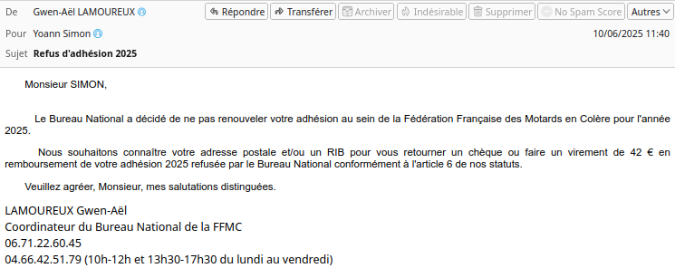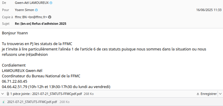 - En date du 10 juin 2025, le Bureau National de la FFMC, par la voix de son coordinateur Gwen-AĂ«l Lamoureux, a adressĂ© un courriel Ă Yoann Simon notifiant le refus de son adhĂ©sion 2025, accompagnĂ© dâune demande de coordonnĂ©es bancaires afin de rembourser les 42 ⏠de cotisation.
