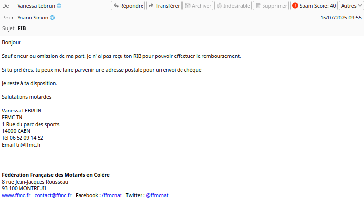 - En date du 16 juillet 2025, Vanessa Lebrun, agissant pour la FFMC TN au nom du Bureau National, adresse un courriel Ă Yoann Simon lui rĂ©clamant un RIB ou une adresse postale afin dâeffectuer le remboursement de son adhĂ©sion 2025 refusĂ©e.