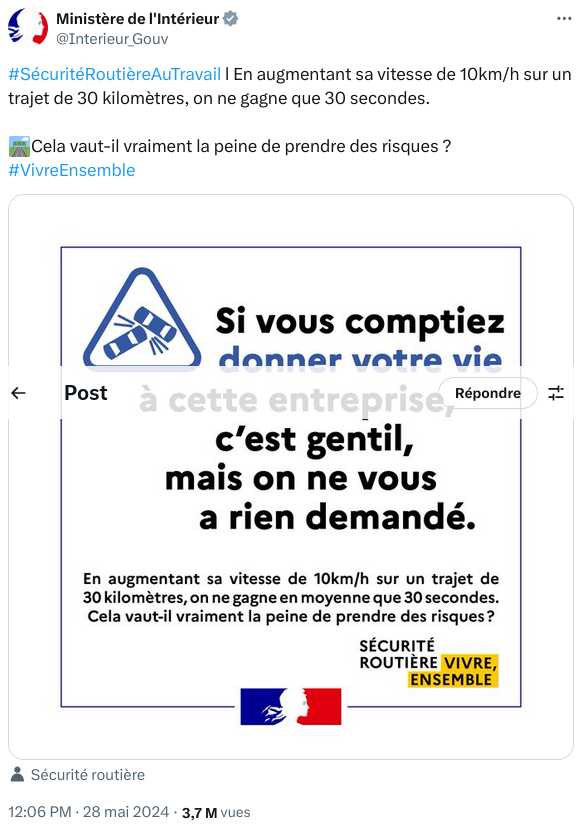 On rĂ©agit au tweet du MinistĂšre de lâIntĂ©rieur qui cite un message de la SĂ©curitĂ© RoutiĂšre au travail.